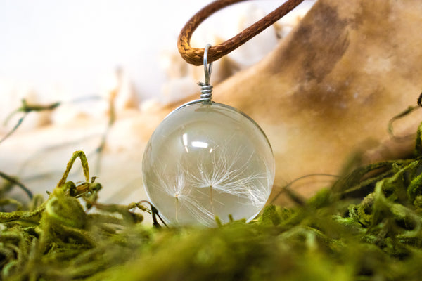 This clear epoxy resin necklace contains a real dried dandelion seed suspended inside, traditionally associated with wishes, intention setting, and quiet hope. The seed is preserved in crystal clear resin, creating a lightweight and durable piece meant for everyday wear.