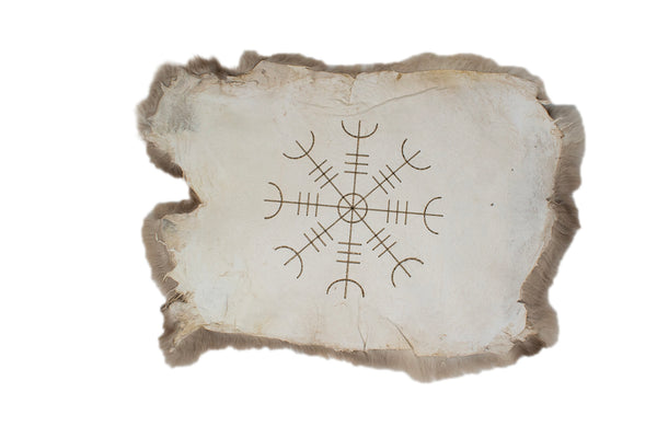 This rabbit hide altar cloth features the Helm of Awe, a powerful protective stave found in several Icelandic grimoires. Burned directly into the hide, the stave forms an eightfold shield meant to strengthen courage, ward off harm, and reinforce the will of the one who bears it. In surviving manuscripts, the Helm of Awe is described as a sign used for overcoming fear, gaining victory, and guarding the mind during confrontation, both physical and spiritual.