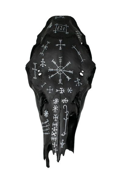 The contrast of white staves over a blackened skull gives this piece an aura of mystery and reverence, embodying both the stark beauty and the ancient power of Icelandic magic. It serves as a potent altar centerpiece, wall display, or ritual object for those who walk the Norse path or honor ancestral traditions of northern magic.