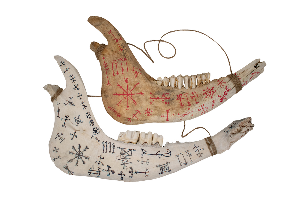 Each cow jawbone is hand-painted with traditional Icelandic magical staves, or galdrastafir, used historically for protection, power, and guidance. These intricate symbols are drawn from old grimoires and carry the essence of Norse magic, wards to repel harm, staves for strength and courage, and sigils for spiritual insight and good fortune.