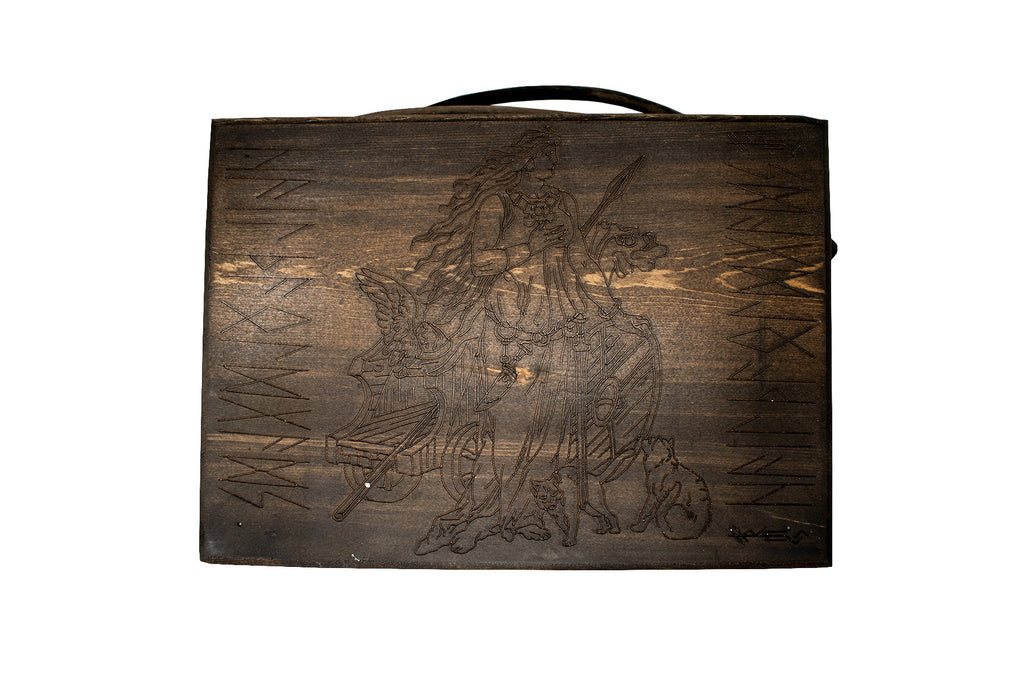 This altar is built as a devotional structure honoring the Norse goddess Freya. The top panel is engraved with a detailed depiction of Freya seated in her chariot, accompanied by her sacred animals, with the phrase HAIL THE OLD GODS written phonetically in the Elder Futhark runes along the sides. The imagery ties directly to her role as a Vanir goddess of magic, sovereignty, and fierce protection.
