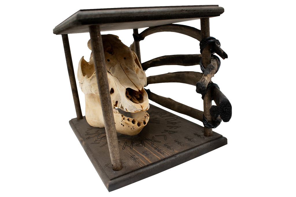 Inside the altar rests an ethically sourced pig skull, a meaningful inclusion since Freya is associated with the boar Hildisvíni in the myths. The interior back wall is lined with cow rib bones, creating a shrine like chamber that amplifies the sense of presence and reverence.