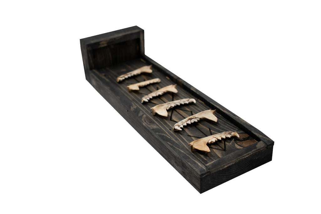 Each jawbone is ethically sourced, naturally cleaned, and arranged in a rising formation that gives the altar a sense of movement and vigilance. A recessed space at the base holds a small flame, allowing fire to activate the bindrune and send intention upward through bone. The dark stained wood and pale bone create a stark contrast that gives the piece a commanding presence.
