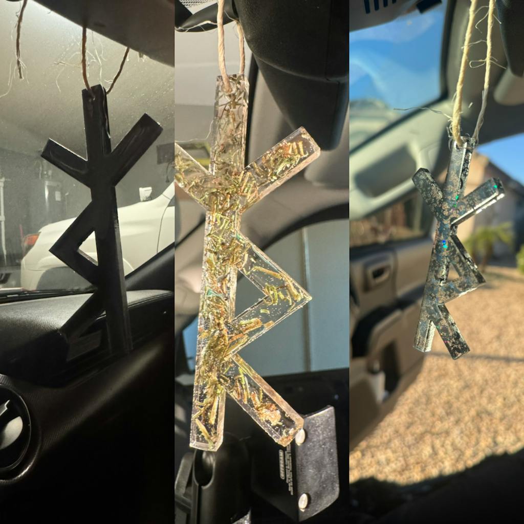 Carry powerful protection wherever the road takes you. Crafted to safeguard the traveler on both physical and spiritual paths, our Safe Travels Bindrune Talisman is a potent charm for warding off danger, grounding your energy, and guiding your journey. Each piece is hand-poured from black epoxy resin and inscribed with a bindrune made from the Elder Futhark, combining Algiz for divine protection and Raidho to represent the journey itself.
