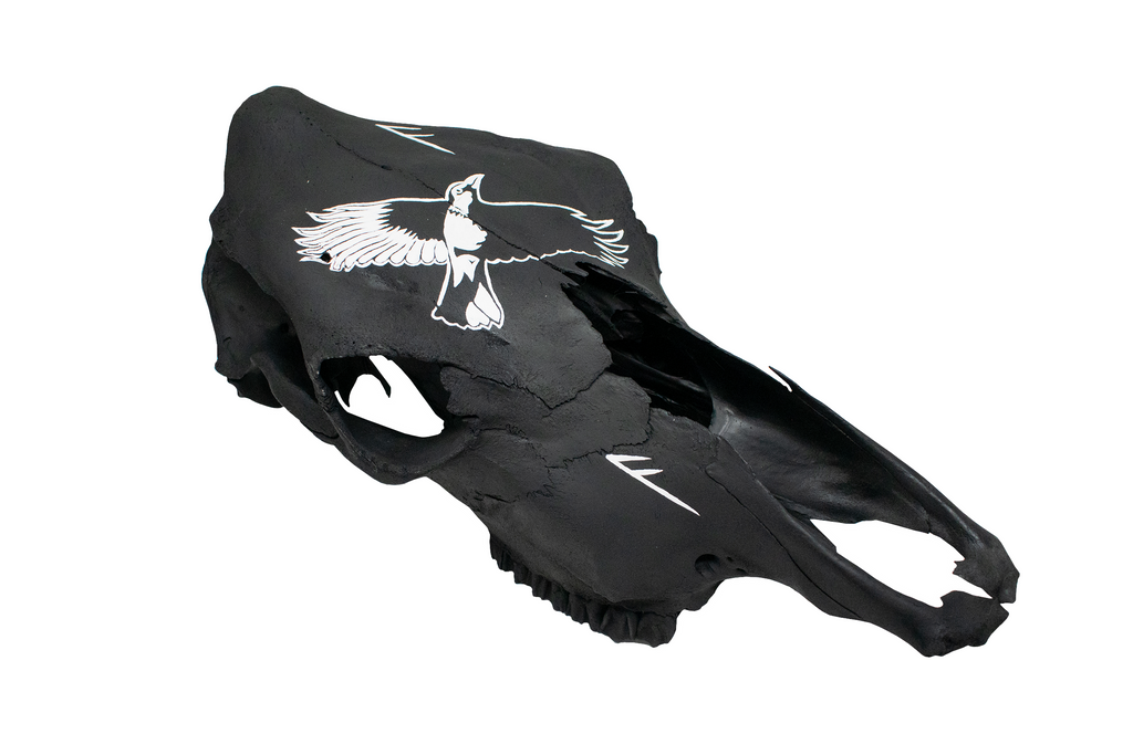This striking cow skull has been transformed into a potent devotional piece through a deep black finish and the hand-painted image of a soaring raven, one of the most sacred animals tied to Odin. The raven, messenger, watcher, and carrier of secrets, spreads its wings across the skull, symbolizing insight, intellect, and the unseen paths of the Nine Worlds.