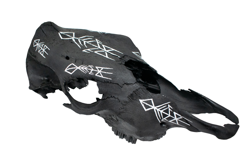 This ethically sourced cow skull has been hand painted in deep black and marked with a powerful bindrune crafted from Mannaz, Othala, and Ansuz. This combination forms a stave for ancestral wisdom, a conduit for guidance, clarity, and the protective presence of the ancestors. The stark white linework against the blackened bone creates a striking ritual piece that anchors any working space with depth and intention.