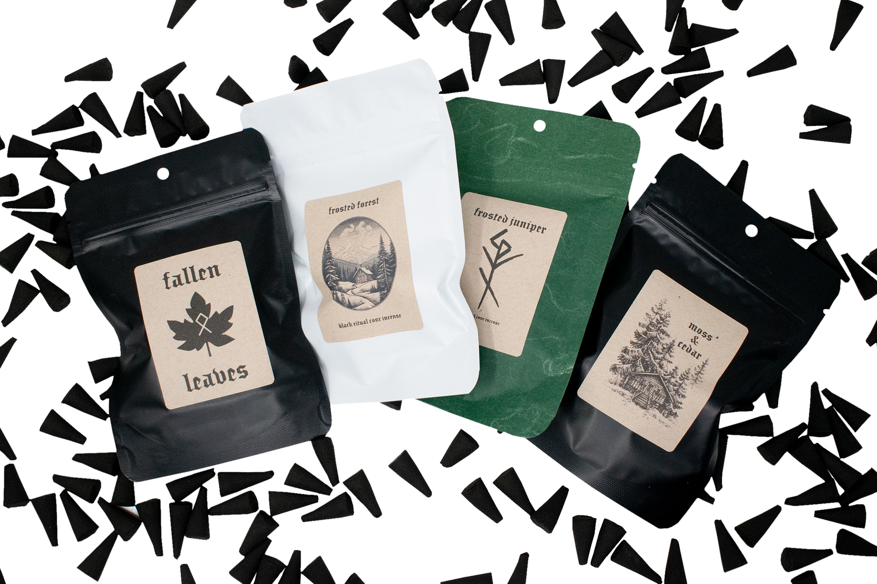Frosted juniper - Adorned with a bindrune for wholeness on the package, this scent brings on the ambiance of an evergreen forest and is our best-selling scent. Juniper banishes all things injurious to good health and attracts good, healthy energies and love.