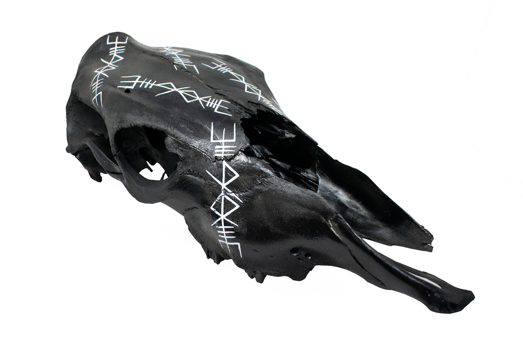 This blackened cow skull is marked with a repeating Thor bindrune, each bindrune crafted from the runes Thurisaz, Othala, and Raidho. Together, these runes form a powerful calling stave used to invoke the Norse god Thor, protector, guardian, and wielder of divine strength.