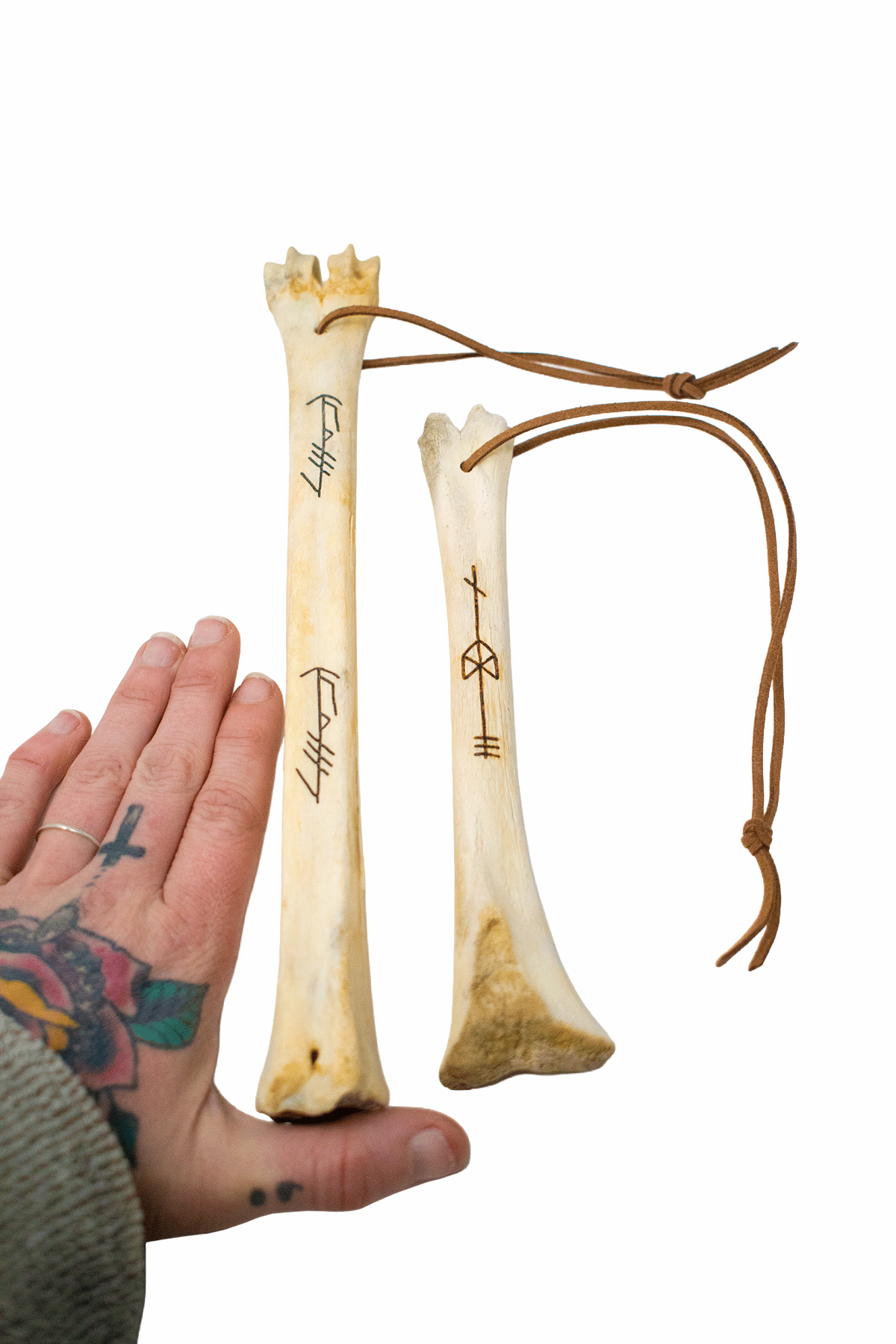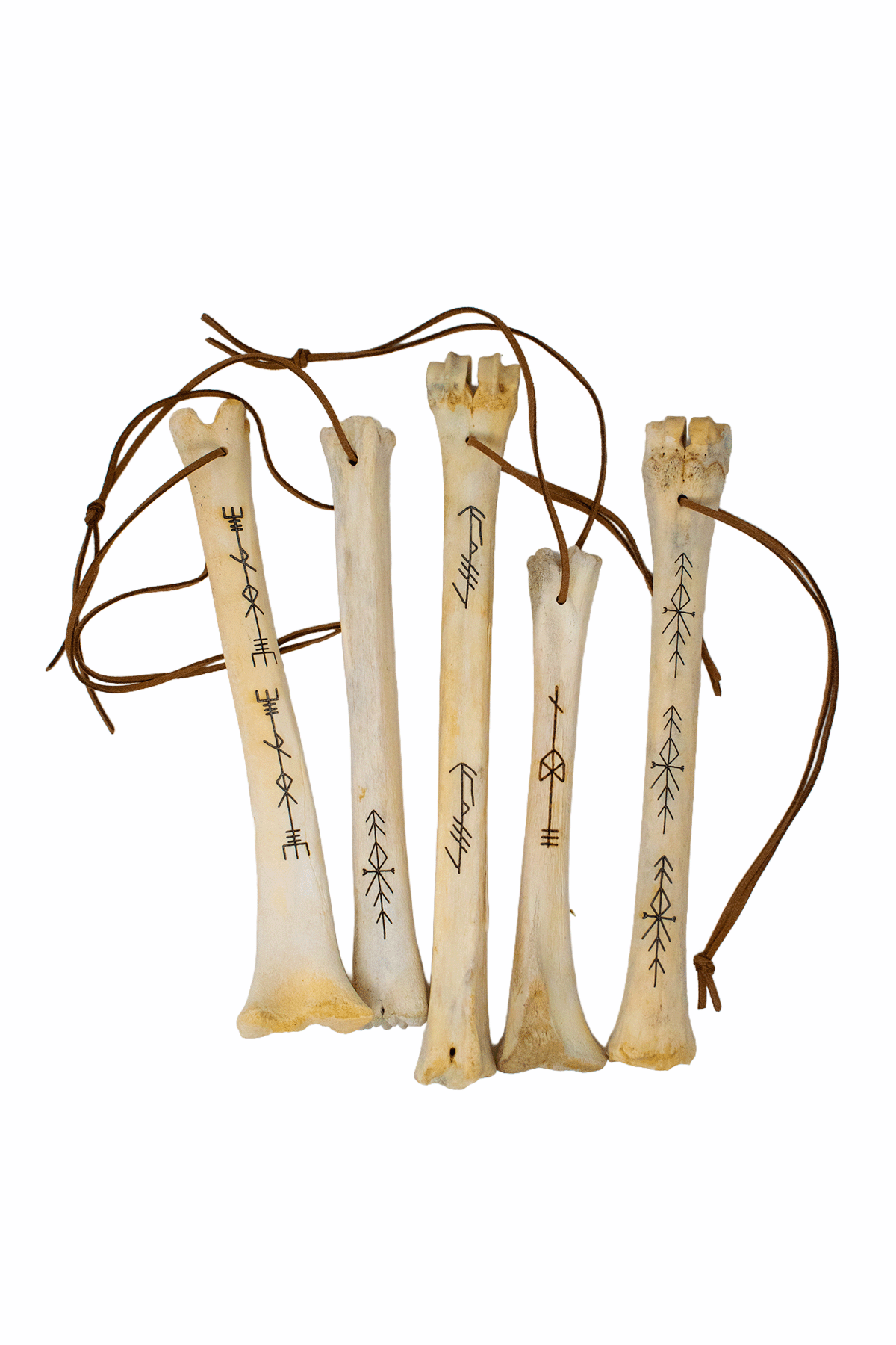These deer leg bone talismans are created as personal ritual tools meant to be carried, hung, or placed on an altar for ongoing spiritual work. Each piece is engraved with a specific bindrune and finished with a leather cord, allowing it to be worn, displayed, or used in ritual.