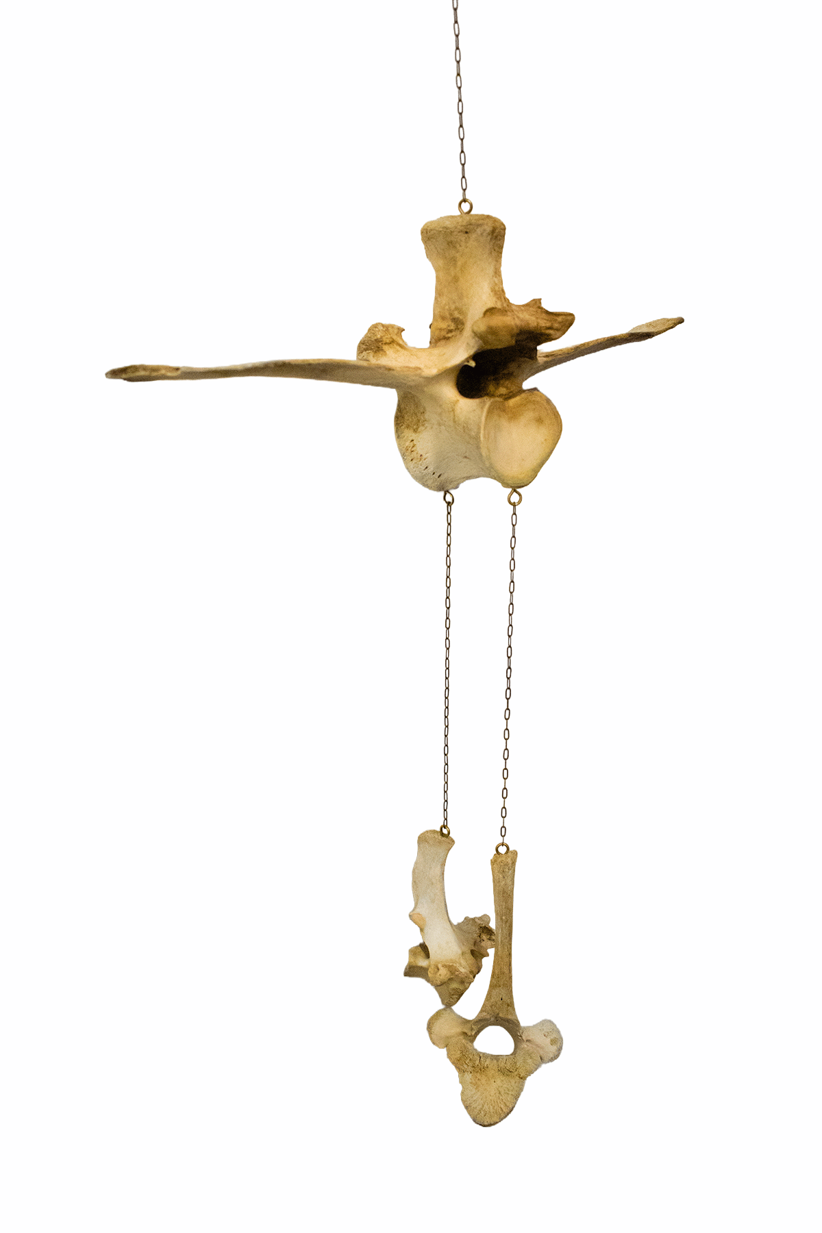 The combination of cow and elk bone brings together endurance, strength, and rooted energy. Suspended with chain to allow natural movement, the bones activate the piece through sound and motion, making it well suited for outdoor altars, porches, threshold spaces, or ritual areas where grounding and stability are needed.