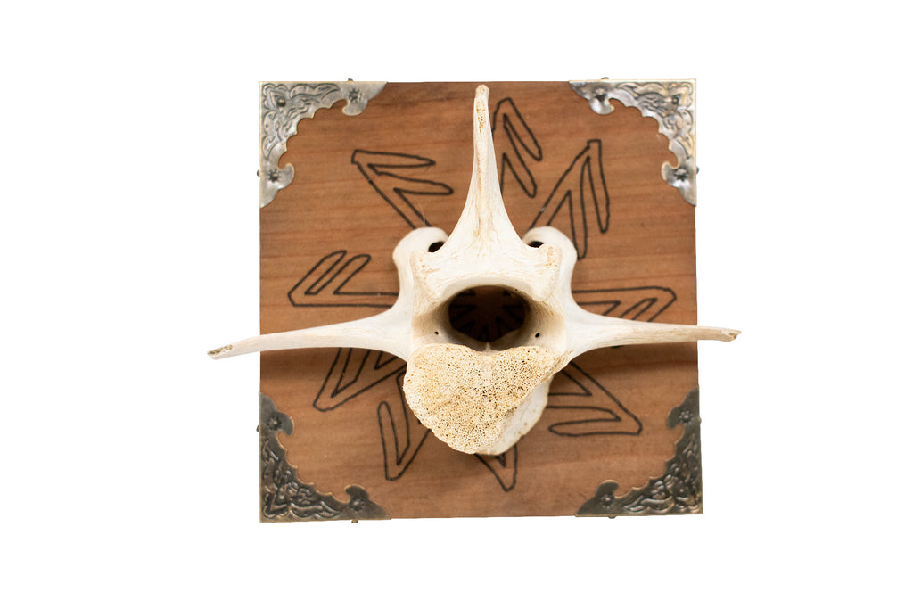 This elk vertebra wall hanger is a ritual focused altar piece created to support spiritual communication and connection with the Norse gods. A real elk vertebra is mounted to a solid wooden backing engraved with a connection to the gods stave formed from nine Ansuz runes. The natural bone structure paired with deliberate symbolic carving makes this piece both visually striking and ritually purposeful.