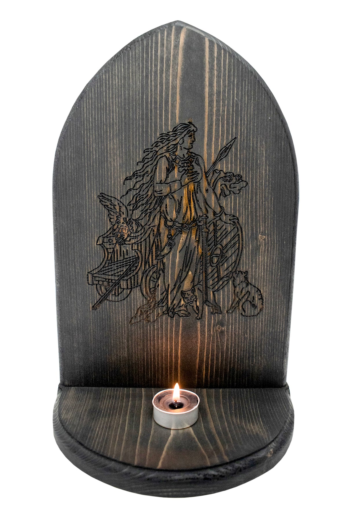 This altar is engraved with a depiction of the goddess Freya. Freya is a goddess associated with love, beauty, fertility, sex, war, gold, and seiðr (magic for seeing and influencing the future).