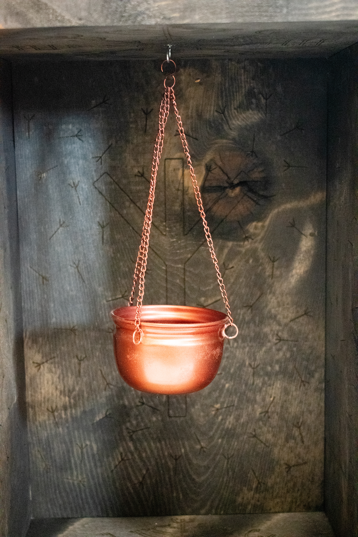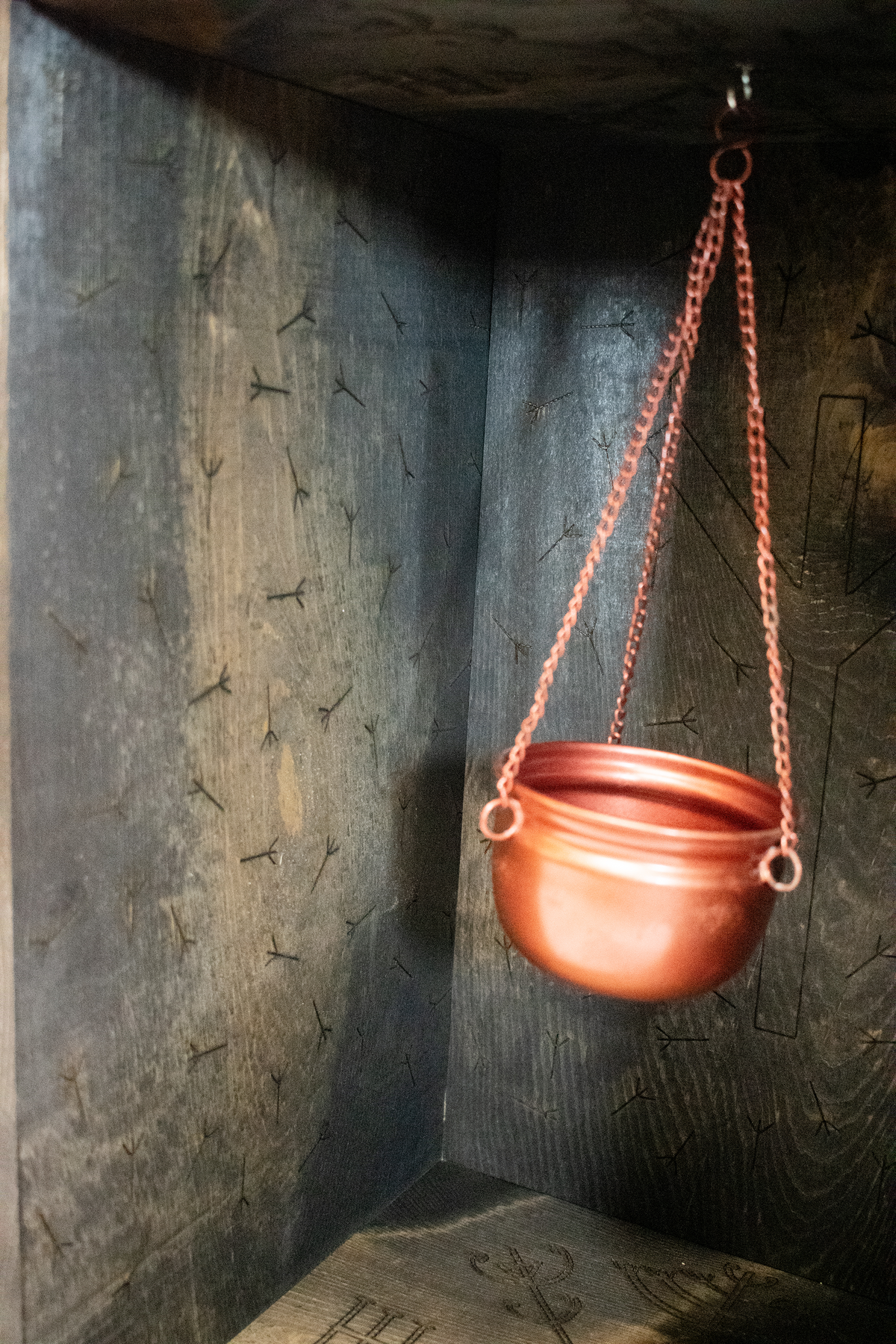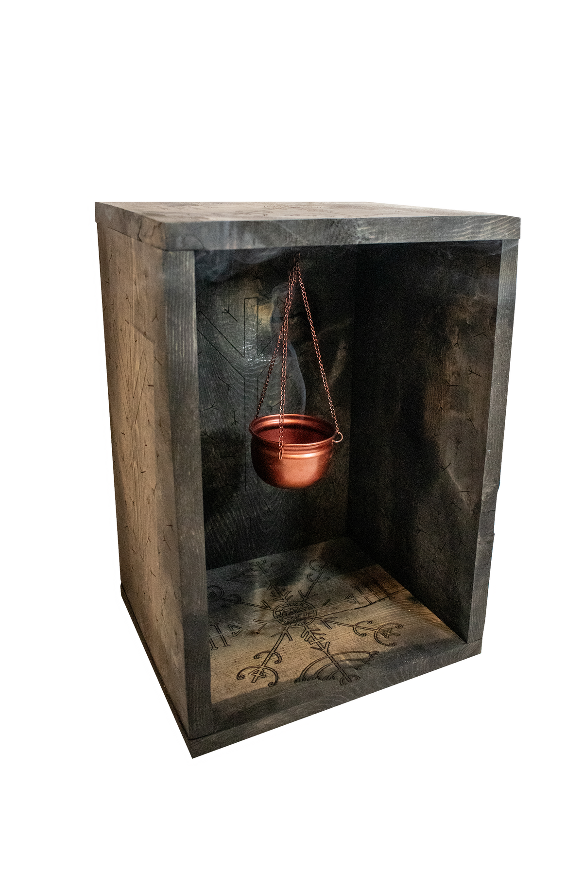 This altar is engraved with repeating algiz runes and veldismagn staves. Both symbols are used for protection.