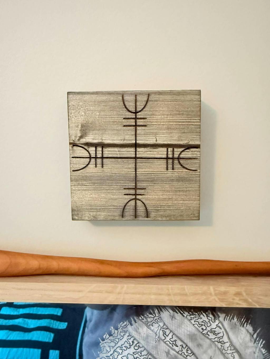 The sigil engraved into the wood is specifically selected for warding and protection, functioning as a barrier meant to repel negativity while reinforcing a sense of safety and stability within the space it inhabits. Each piece is crafted by hand, allowing the natural grain and character of the pine to remain visible, making every hanger one of a kind.