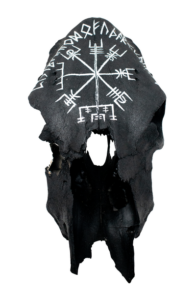 Material: Ethically sourced cow skull, hand blackened and painted with Elder Futhark runes and Vegvísir