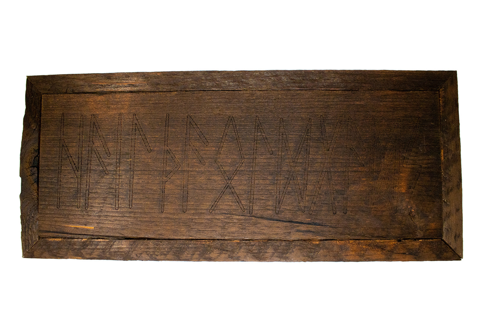 • Engraved phrase reading “Hail the Old Gods” in phonetic Elder Futhark