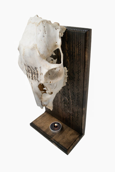 Deer energy carries themes of awareness, instinct, and movement between seen and unseen. When paired with deity-specific bindrunes, the skull becomes a focal point capable of holding intention, honoring the gods, and grounding offerings. The wooden base includes a space for a tealight, allowing illumination to rise beneath the skull and enhance the ritual atmosphere.